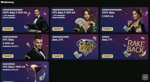 Οι τακτικές μας προωθητικές ενέργειες είναι σχεδιασμένες για σταθερό παιχνίδι, όχι για περίπλοκες εργασίες. Το εβδομαδιαίο cashback μπορεί να επιστρέψει έως 25% των απωλειών και το ακριβές ποσοστό εξαρτάται από το επίπεδο παίκτη σου. Το rakeback μπορεί να φτάσει έως 17% σε συγκεκριμένα παιχνίδια, κάτι που βοηθά αν σου αρέσουν γρήγορες συνεδρίες με πολλούς γύρους. Το Sunday Reload προσθέτει 25% έως €100 κάθε Κυριακή και οι όροι εμφανίζονται στο ταμείο πριν το διεκδικήσεις.